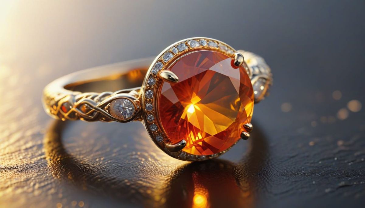 A detailed macro photograph of a woman's fire opal gold ring. The image captures the ring's vibrant colors and glittering reflections under warm sunlight, highlighting its intricate details with a shallow depth of field.