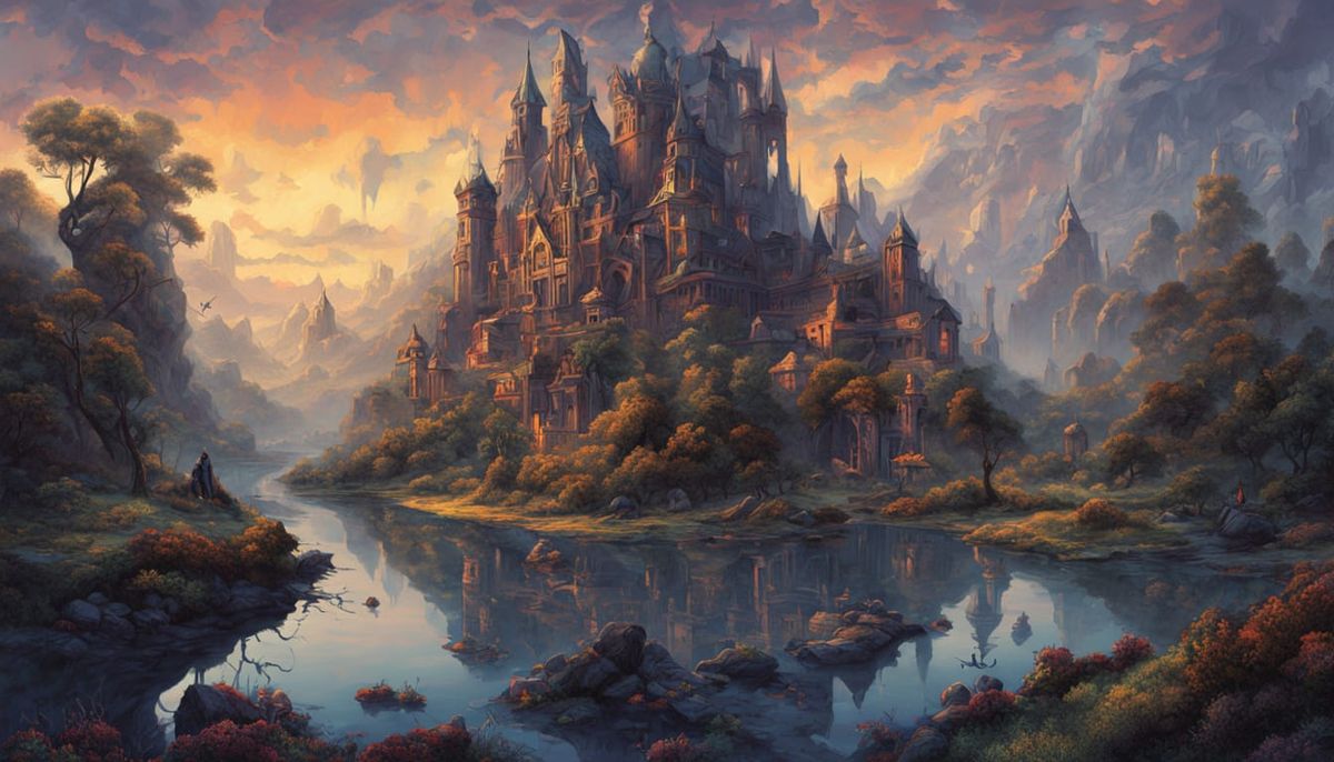 This image depicts a group of people navigating a dark cave with torches, revealing an underground lake that reflects the dim light. The scene evokes a sense of ancient mystery and discovery, rendered in a dramatic, atmospheric digital matte painting style.
