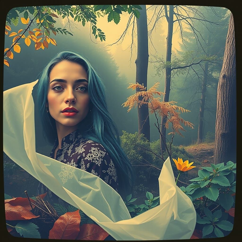 A photorealistic image of a dense, foggy forest with muted greens and golds. A solitary yellow flower blooms as a woman with teal hair emerges from the mist. Cinematic lighting enhances the mystical atmosphere.