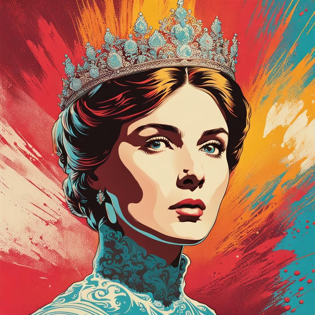This image shows a hyperrealistic vintage poster screenprint of the Russian princess Anastasia. The shot is intricately detailed with a colorful background and side lighting.