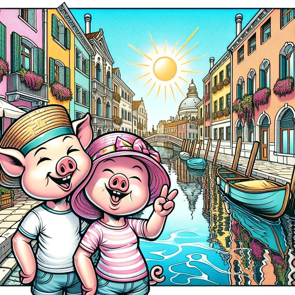 This vibrant comic illustration features two cheerful pigs taking a selfie by a sunny European canal. Pastel buildings, boats, and flowers create a warm vacation atmosphere.