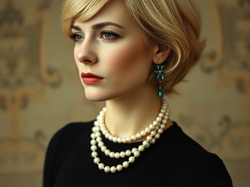 This image shows a vintage-style portrait of a blond woman wearing a pearl necklace and turquoise earrings. The artwork features subtle film grain, lens distortion, and muted sepia tones with hand-painted colors.