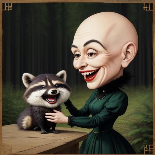 a high quality professional cinematic grade photograph of a caricature bald woman with an oversized head laughing at a raccoon, surreal, forest surrealism, vintage, beautiful, cute, whimsical, rich color contrast, professional photography, beautiful, john bauer, cartoon, highly detailed, fine detail, ...