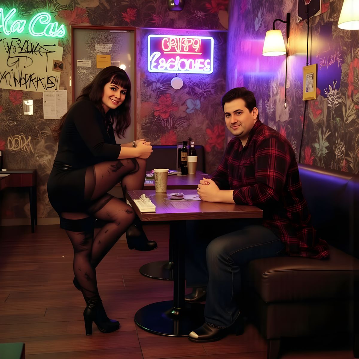 This image shows a gothic woman and a man in a punk club, captured in a realistic early 2000s style. The scene features a graffiti-filled, beat-up environment.