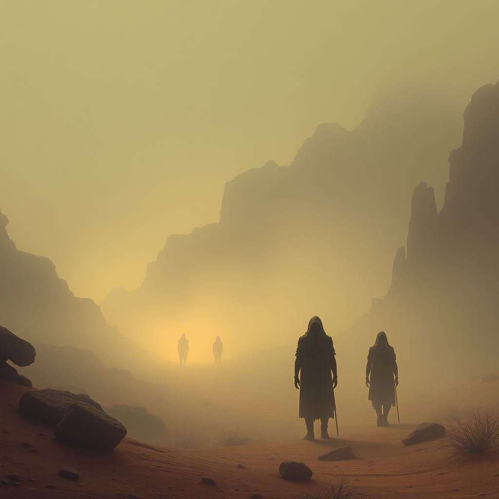Mysterious ancient Anasazi figures fade into desert mist in this atmospheric, haunting scene rendered in a digital painting style.