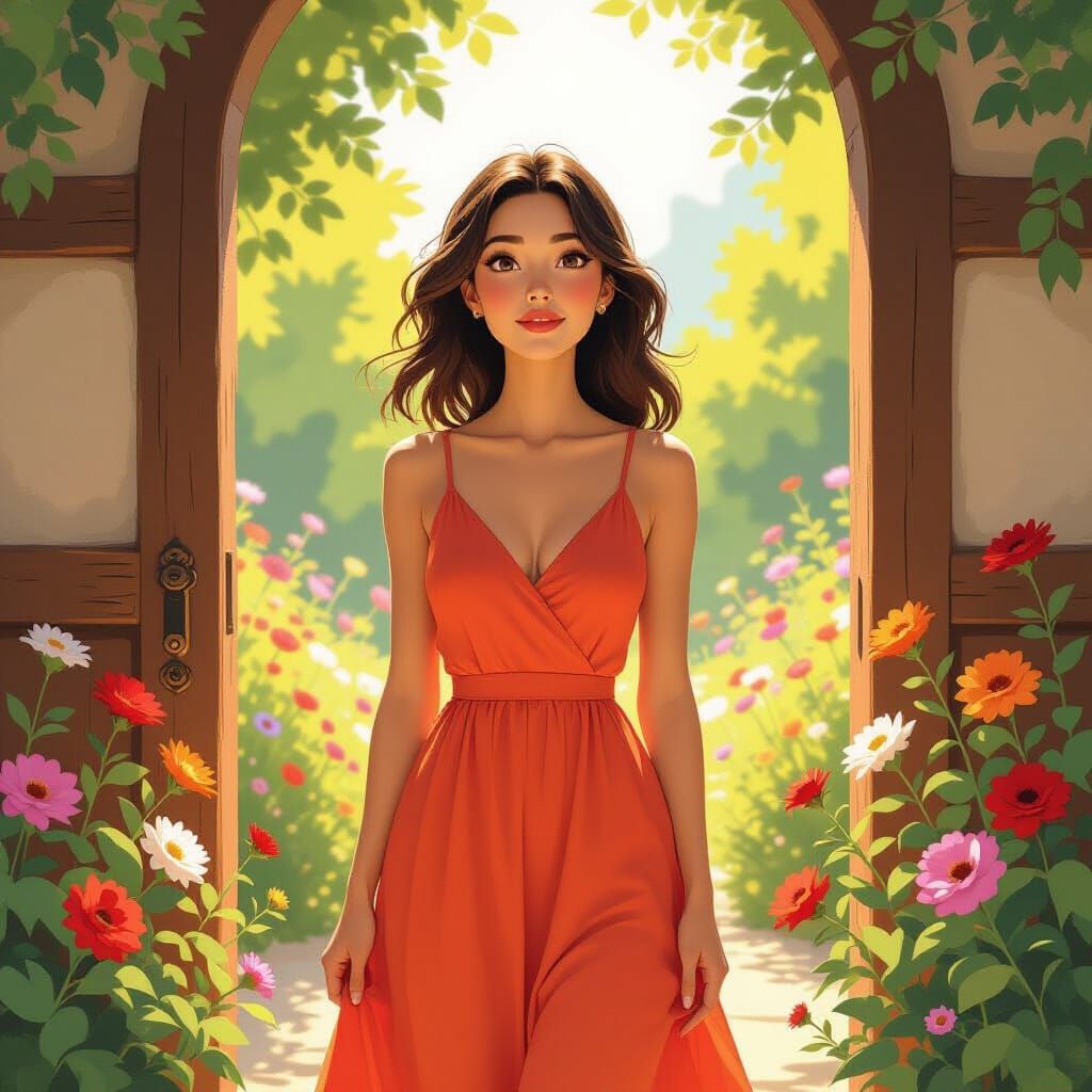 A woman in a sundress stands in a doorway filled with flowers, her expression conveying relief and hope. The image is rendered in a whimsical art style, with intricate details and soft textures.