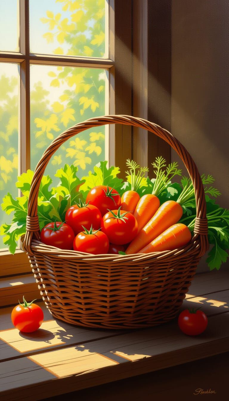 This image shows a rustic basket overflowing with fresh vegetables. Rendered in a realistic oil painting style, it features rich textures and warm, dramatic lighting.