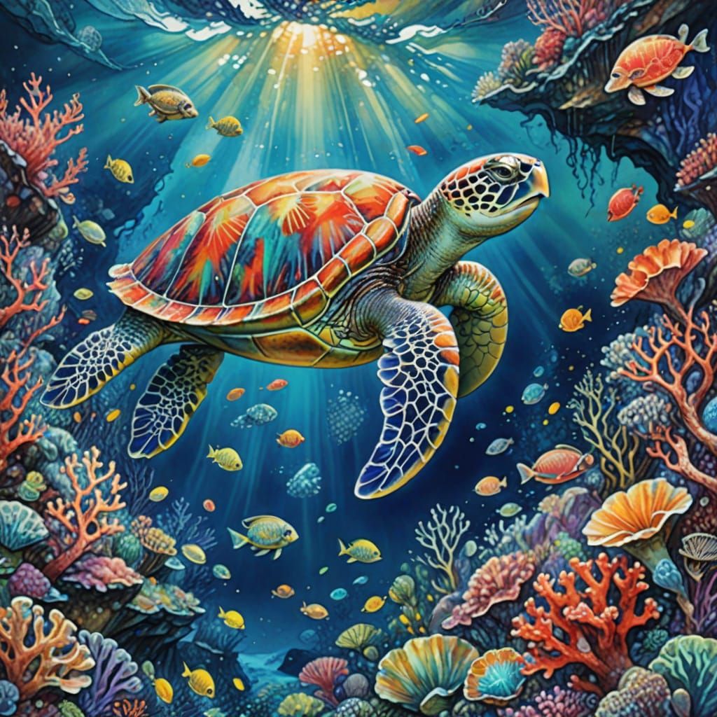 This image features a beautiful coral reef with a curious sea turtle gliding above a vibrant bed of corals, created in a stylised watercolour aesthetic reminiscent of fine art illustrations.