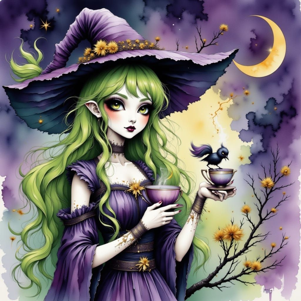 A magical scene featuring a witch with her familiar, holding a glowing cup of tea. Rendered in a dreamlike moon watercolor and alcohol ink style with purple, lime, and gold accents.