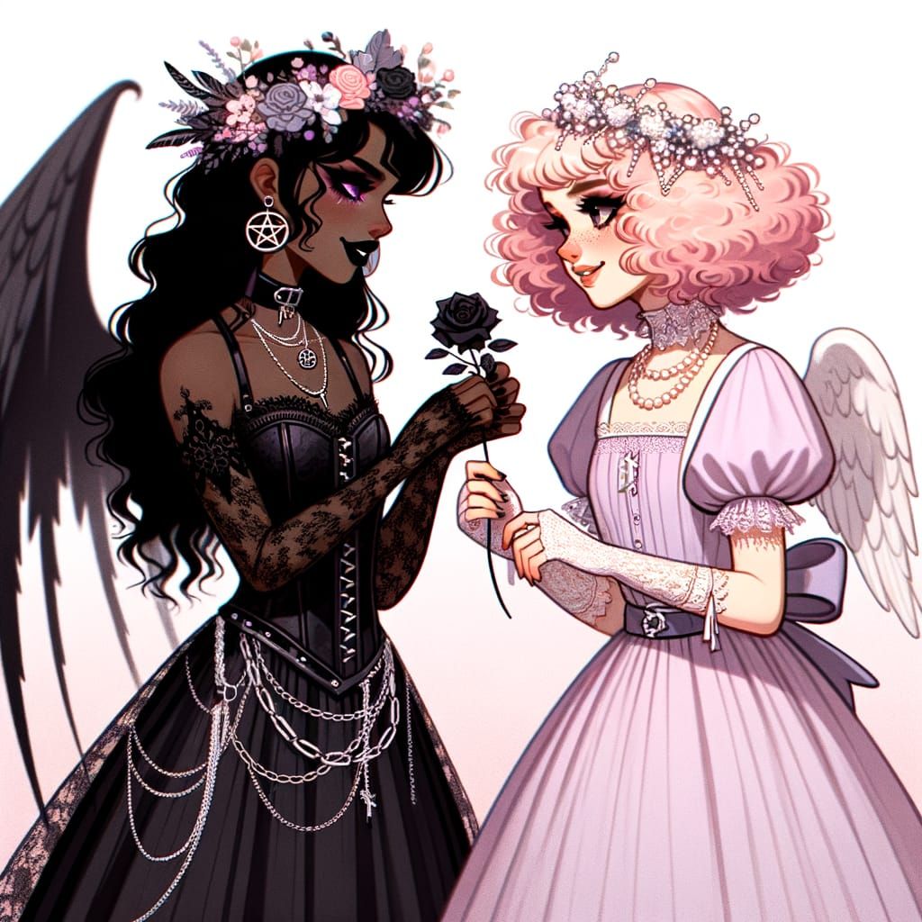 This image captures a tender moment between two contrasting young women, a Gothic-inspired witch and a soft, pastel-themed angel. The goth witch is adorned in dark, edgy attire, while the pastel angel wears a delicate, whimsical ensemble.