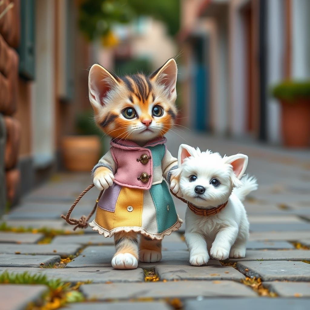 This image shows a charming kitten walking a tiny dog in a vibrant street scene, adorned with intricate details and pastel-colored patchwork clothes.