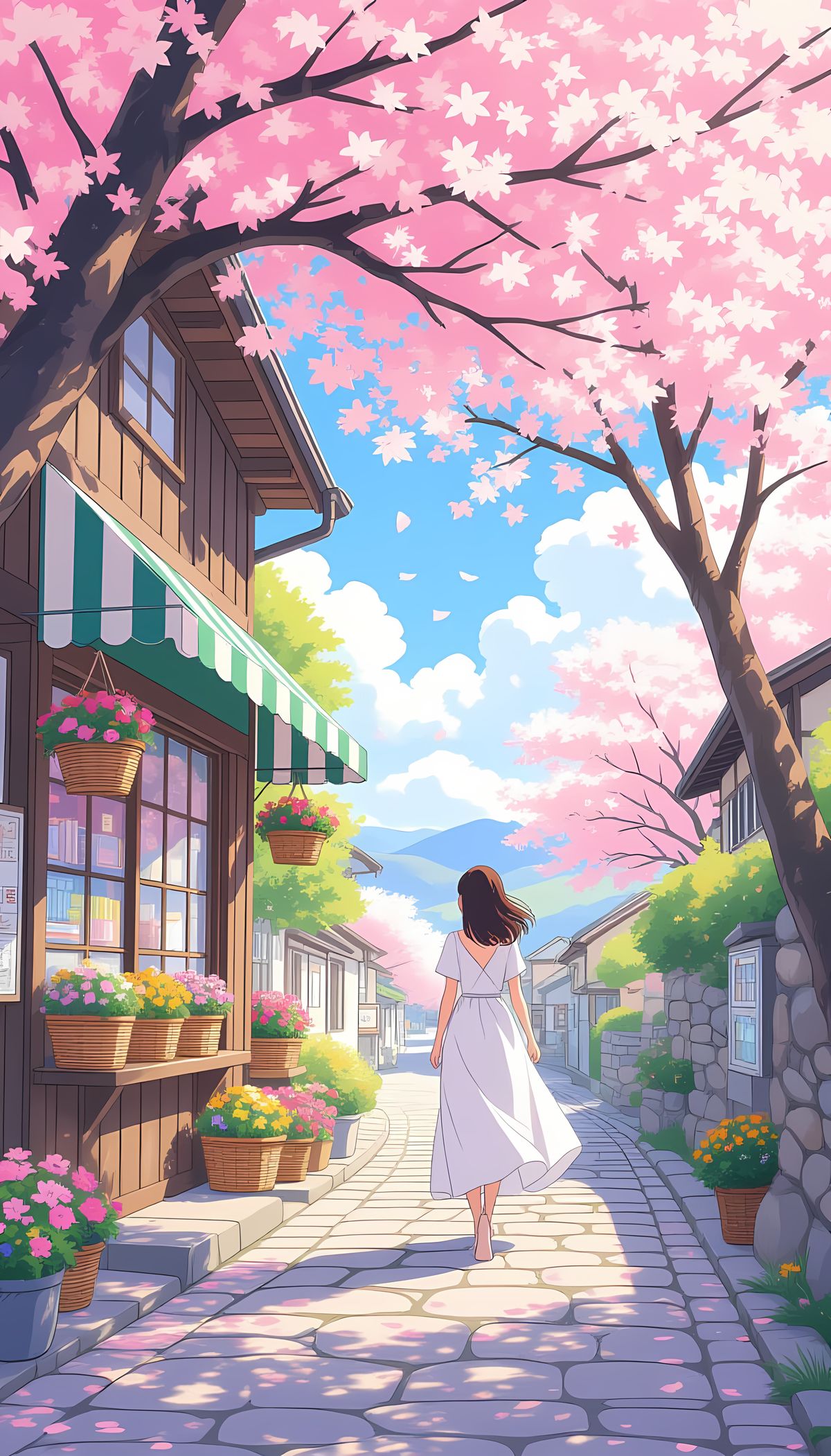 This image shows a quaint shop with a striped awning, overflowing with flowers, set against a backdrop of a cherry blossom tree and blue sky. It is rendered in a detailed anime style.