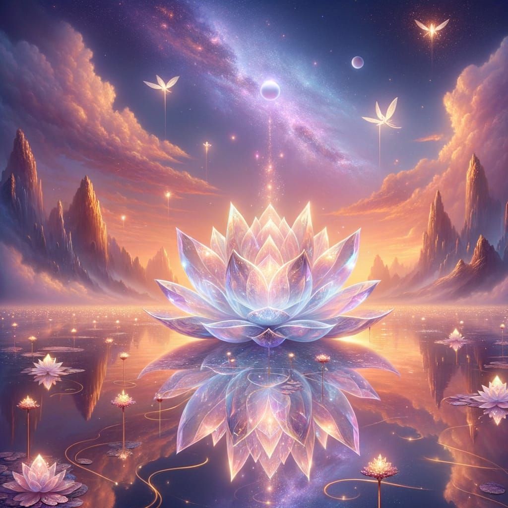 A breathtaking fantasy landscape featuring a glowing crystal lotus on a mirror lake, reflecting a twilight sky. The image evokes magical realism with luminescent orbs and levitating mountains in a painterly style.