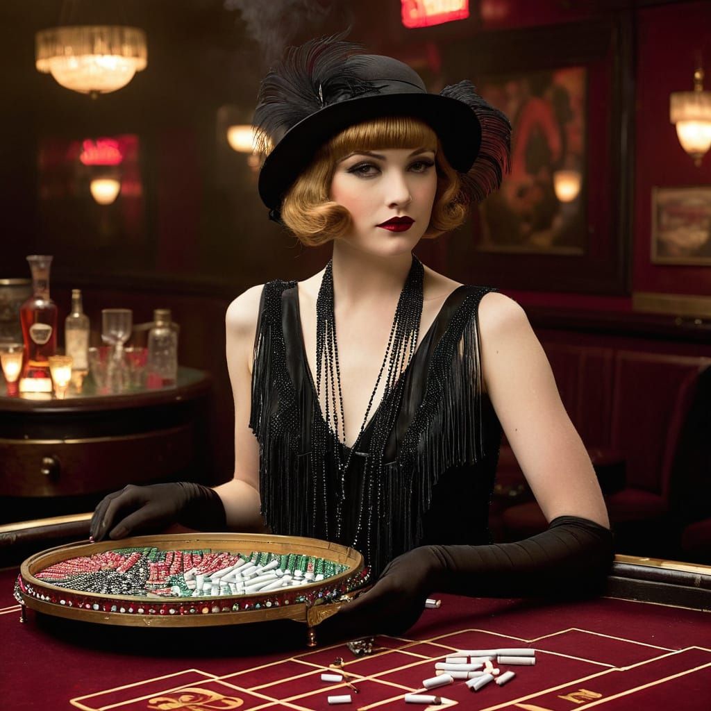 This image shows a flapper-dressed cigarette girl holding a tray in a smoky 1920s speakeasy. The image has noir tones and vintage flair, reminiscent of Art Deco style.
