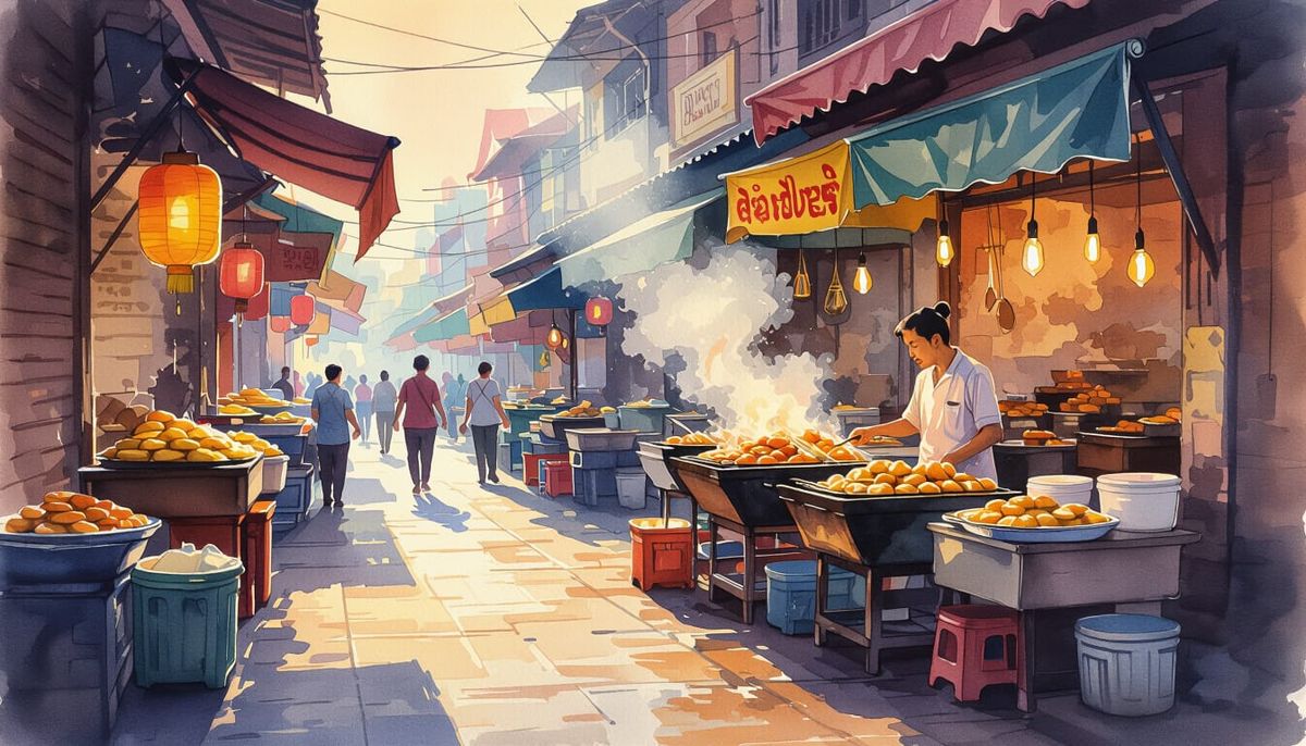 A lively watercolor scene of a Southeast Asian street food market. Experience the sizzle of grills and exotic aromas in a vibrant, culinary adventure setting with warm, golden hour lighting.