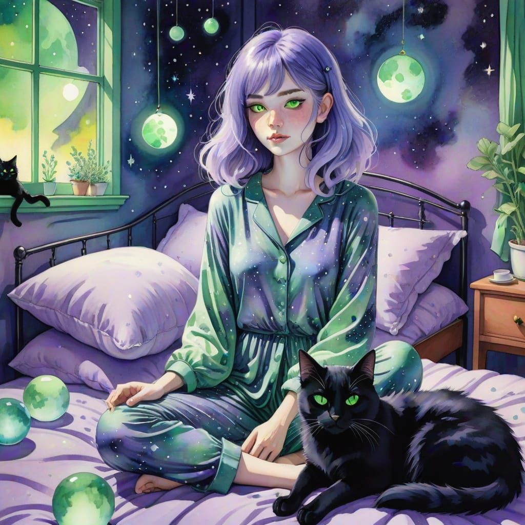 whimsical illustration of a young woman with flowing lavender and indigo hair, wearing celestial print pajamas, sitting cross-legged on a bed. A fluffy black cat with luminous green eyes rests beside her. The background features a cosmic themed room with soft, glowing orbs. Watercolor effect, high detail, ...