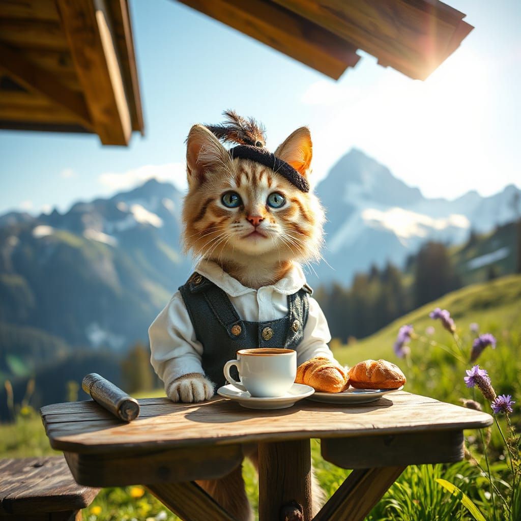 This image shows a charming, anthropomorphic kitten in lederhosen enjoying hot chocolate and pastries at a rustic table. Set against a hyperrealistic backdrop of the Swiss Alps, the style blends photorealism with storybook illustration for a cozy feel.