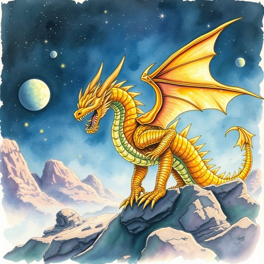 This image shows a regal, golden dragon space warrior standing on an alien planet, created in a soft, watercolor style.