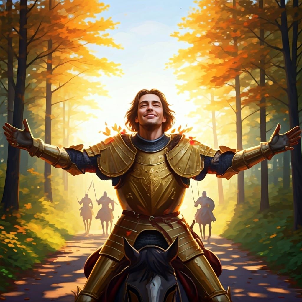 This image shows a nobleman in golden armor riding through a forest, celebrating with his knights. The artwork evokes a Renaissance style with impressionistic, soft brushstrokes and pastel colors to capture a cinematic, romantic adventure.