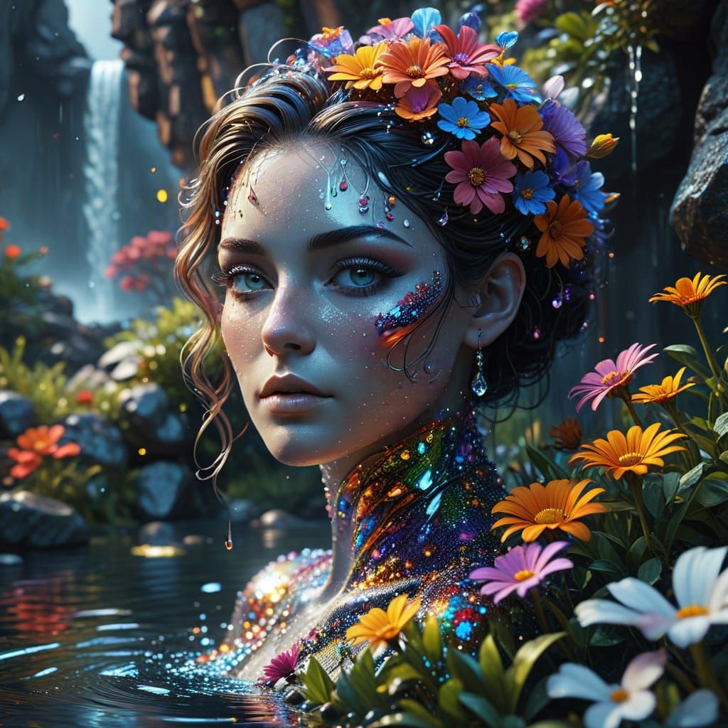This image depicts a woman composed of rainbow glitter, flowers, and water droplets, set against a black backdrop. The digital artwork features triadic colors and dynamic lighting, reminiscent of fantasy art.