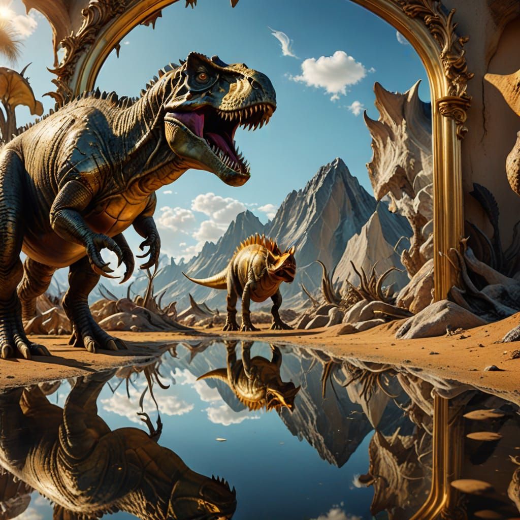 This image shows a surreal reflection of dinosaurs in a prehistoric landscape. The artwork features vibrant colors and detailed textures in a dreamlike wildlife illustration, reminiscent of Salvador Dali.