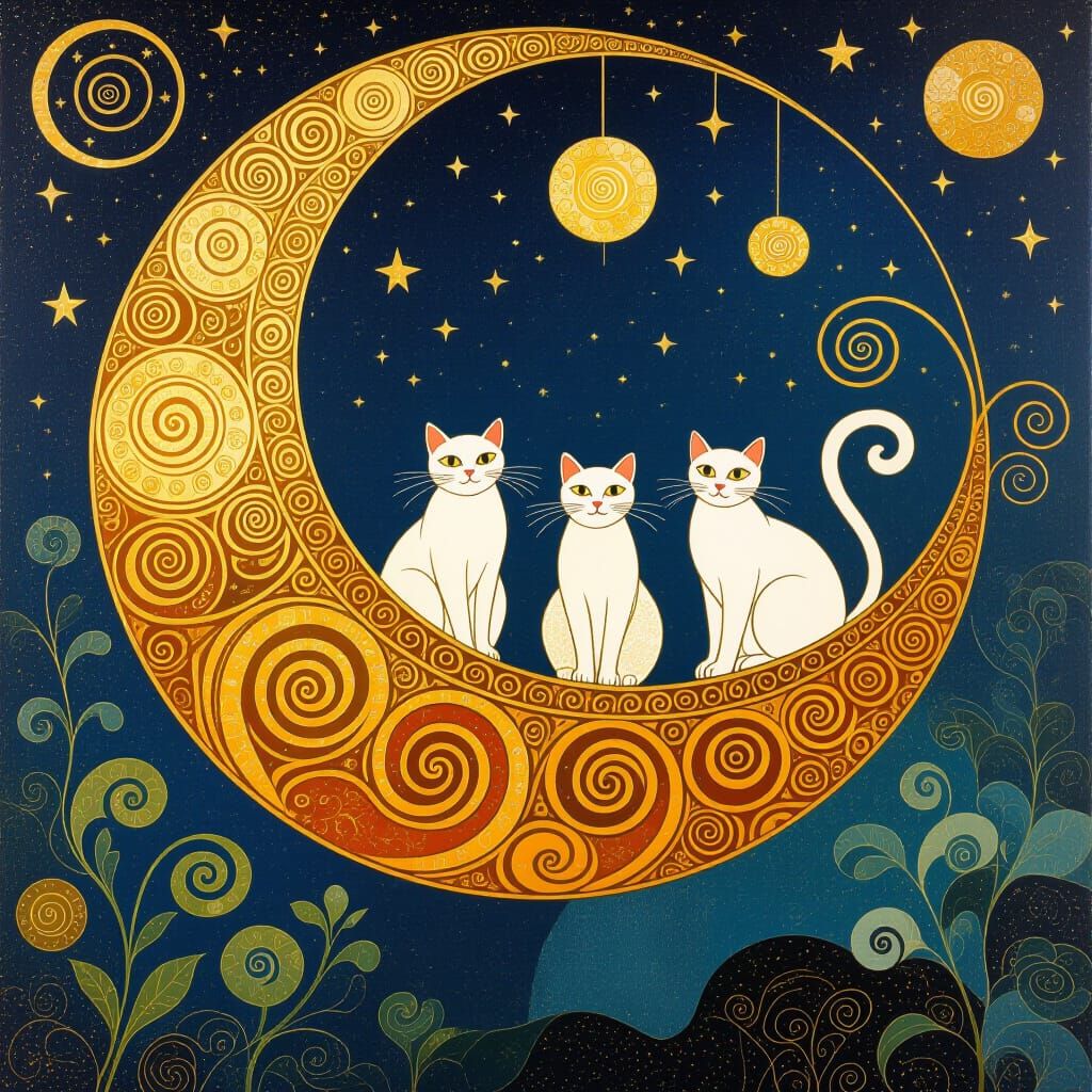 A surreal spaceship adorned with gold patterns and playful cats floats under a starry night sky with falling gold marbles. The image blends Art Nouveau and fantasy elements.