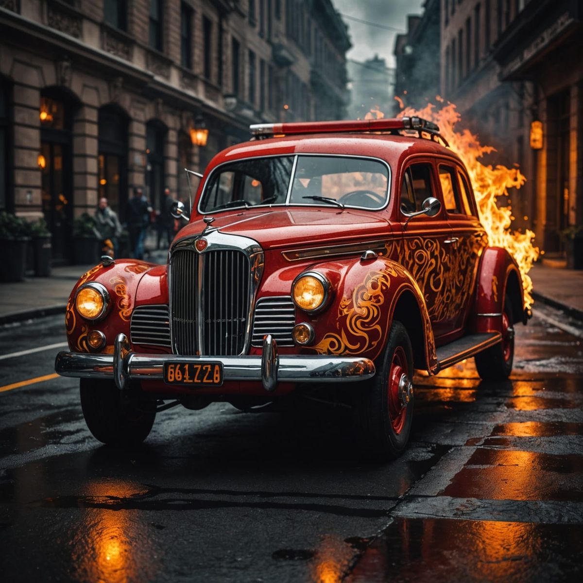 This image shows a hyperrealistic car engulfed in flames. The composition features intricate details, sharp focus, high contrast and atmospheric mood, rendered in cinematic style.