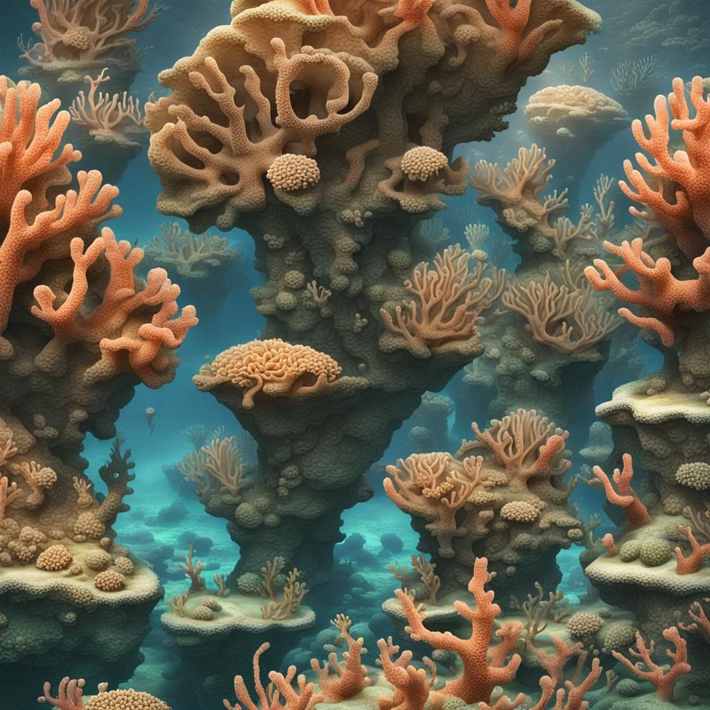 This image shows ancient coral formations resembling humanoid guardians, surrounded by sea creatures. The coral giants appear shaped by centuries of ocean currents.