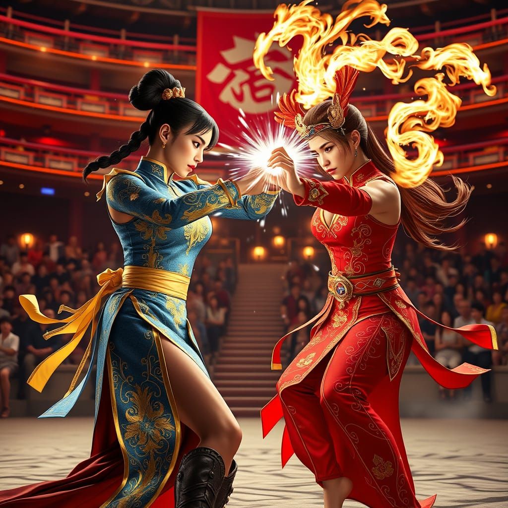 This cinematic image captures the electrifying moment of a high-stakes martial arts showdown between two legendary fighters. A mesmerizing blend of vibrant colors, intricate details, and dynamic energy, this scene is set against a richly decorated backdrop of a traditional arena, complete with intricatel...