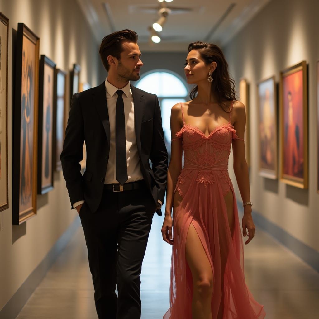 A captivating image portrays a thin man with a pompadour hairstyle and an attractive brunette woman touring a fashion museum. The scene evokes a sense of modern style and intimate connection.
