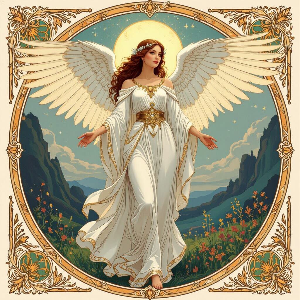 This image shows a female angel in white robes with gold accents, set against a heavenly backdrop. It evokes Art Nouveau aesthetics with dramatic lighting and vibrant colors.