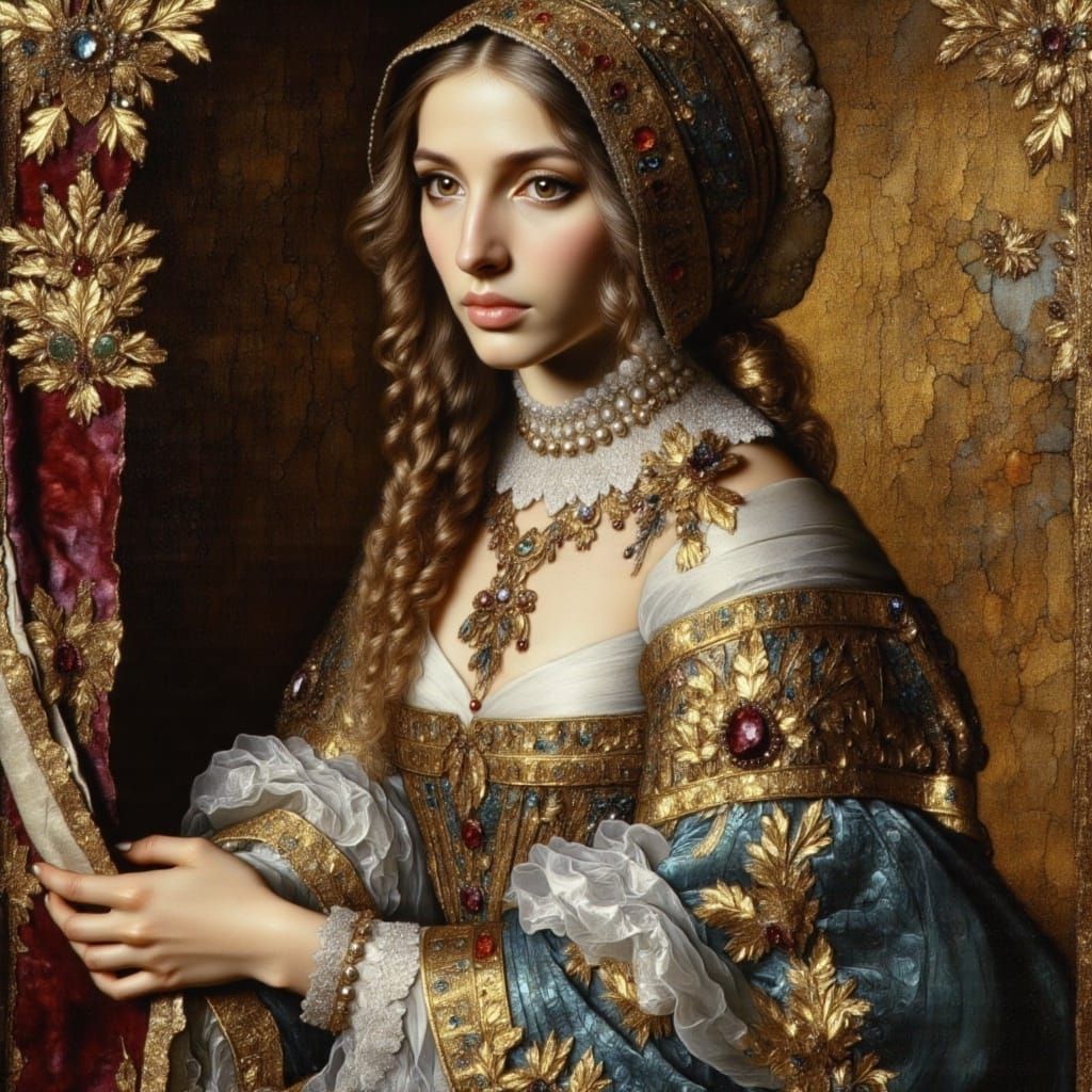 This image shows a beautifully dressed woman from the mid 17th century, adorned in a lavish gown with intricate gold embroidery. The artwork features a rich, metallic aesthetic reminiscent of the period.
