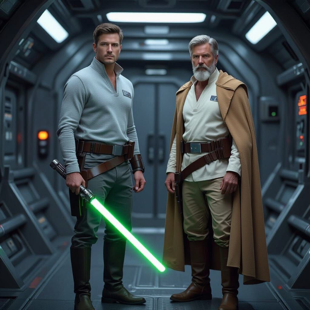 This image shows two men in a dimly lit corridor of a spaceship. One holds a green lightsaber. The scene features detailed textures and a cinematic atmosphere, with industrial designs and futuristic realism.