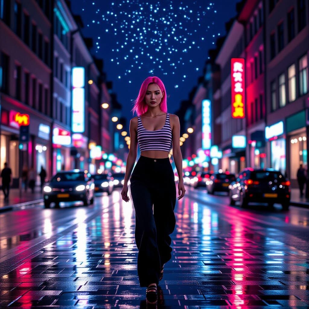 A cyberpunk image of a stylish woman walking on a wet city street at night. Neon lights reflect off the cobblestones in this futuristic street scene with a vibrant color palette.