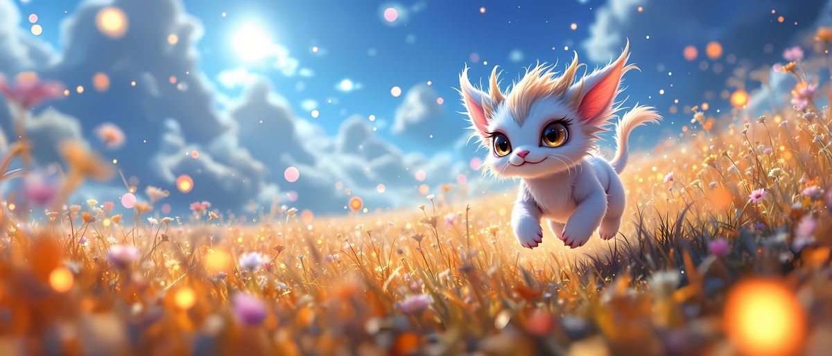 This image showcases a small, mythical creature running in a sun-drenched fantasy field, surrounded by fireflies and cinematic wonder. The scene is characterized by intricate details, vibrant colors, and a sense of drama and enchantment.