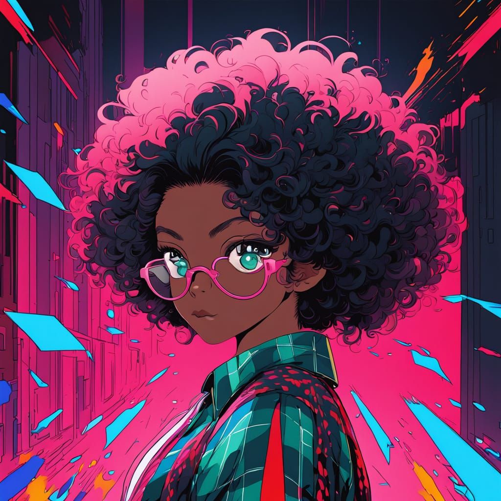 This image is a vibrant anime portrait of a college girl with an Afro, wearing pink glasses and a black and teal flannel, in a bold and colorful style reminiscent of Studio Trigger's aesthetic.