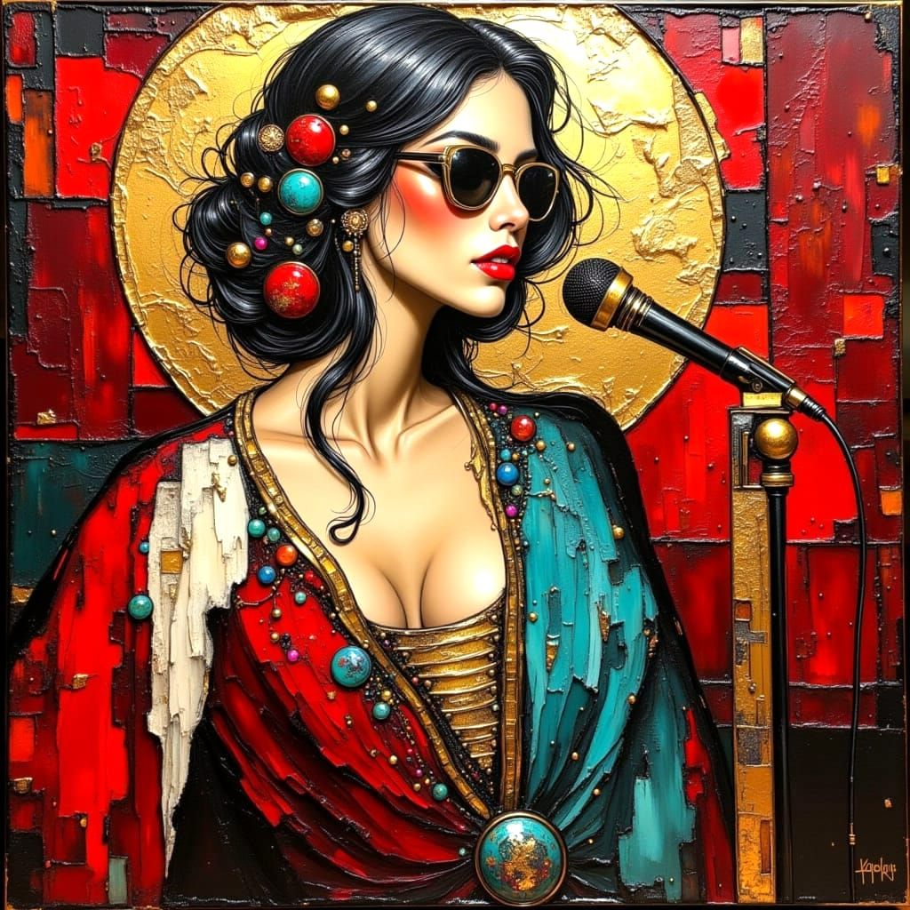 This image depicts a stunning singer on stage in a lavish, velvet-lined club, set against a backdrop of rich colors and textured metallics, blending elements of abstract art and art deco flair.