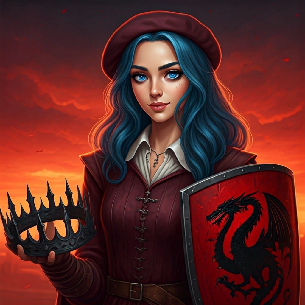 This image shows a young woman with blue hair and dusky skin, dressed in 16th-century noble attire, holding a black iron crown and a shield with a red dragon emblem. The scene is set against a dramatic red sky.