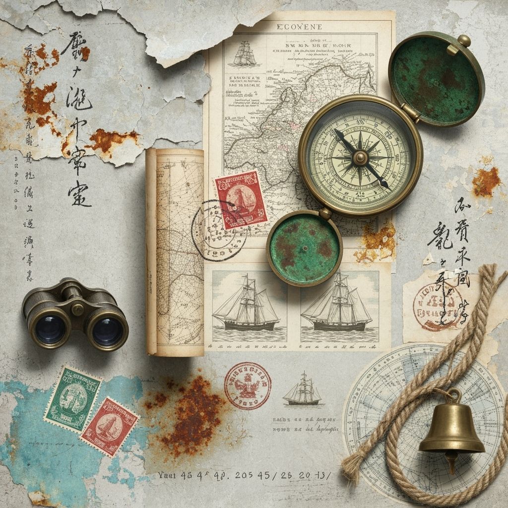 This image features an antique brass compass, a rolled map, postage stamps, and binoculars against nautical charts. Muted colors and weathered textures evoke a nostalgic, contemplative atmosphere.