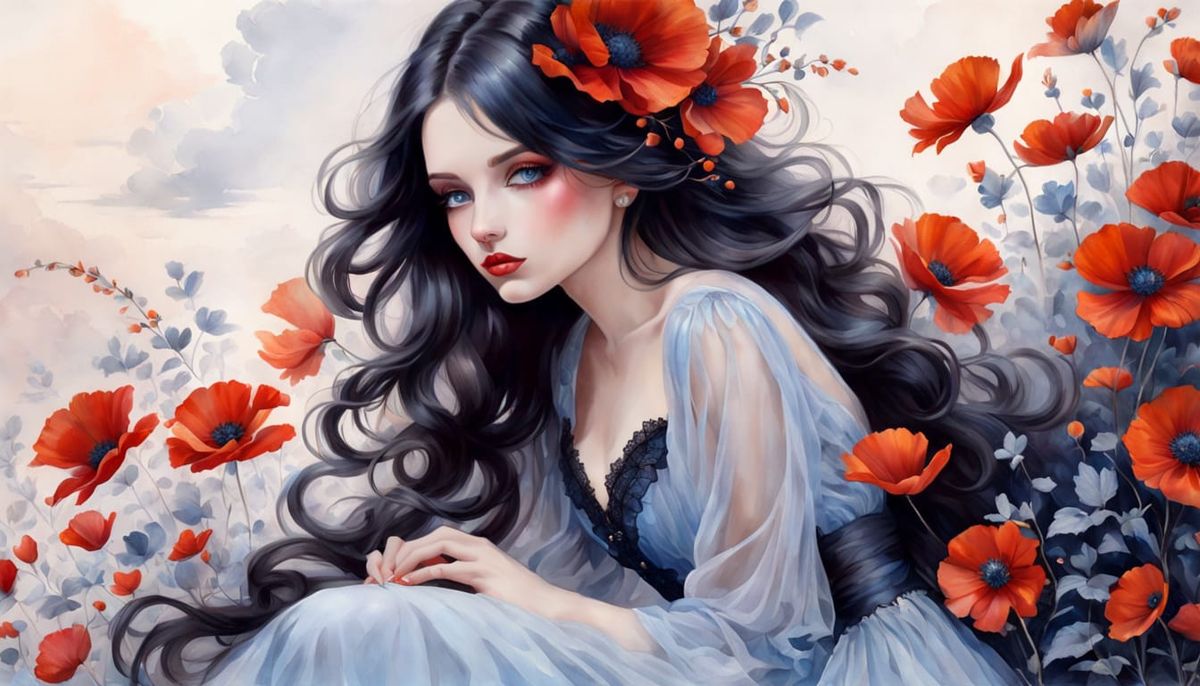 This image shows a goth woman with dark hair and blue eyes gazing at the viewer. She wears a Victorian dress and sits in front of a dreamy background as an ink and watercolor painting.