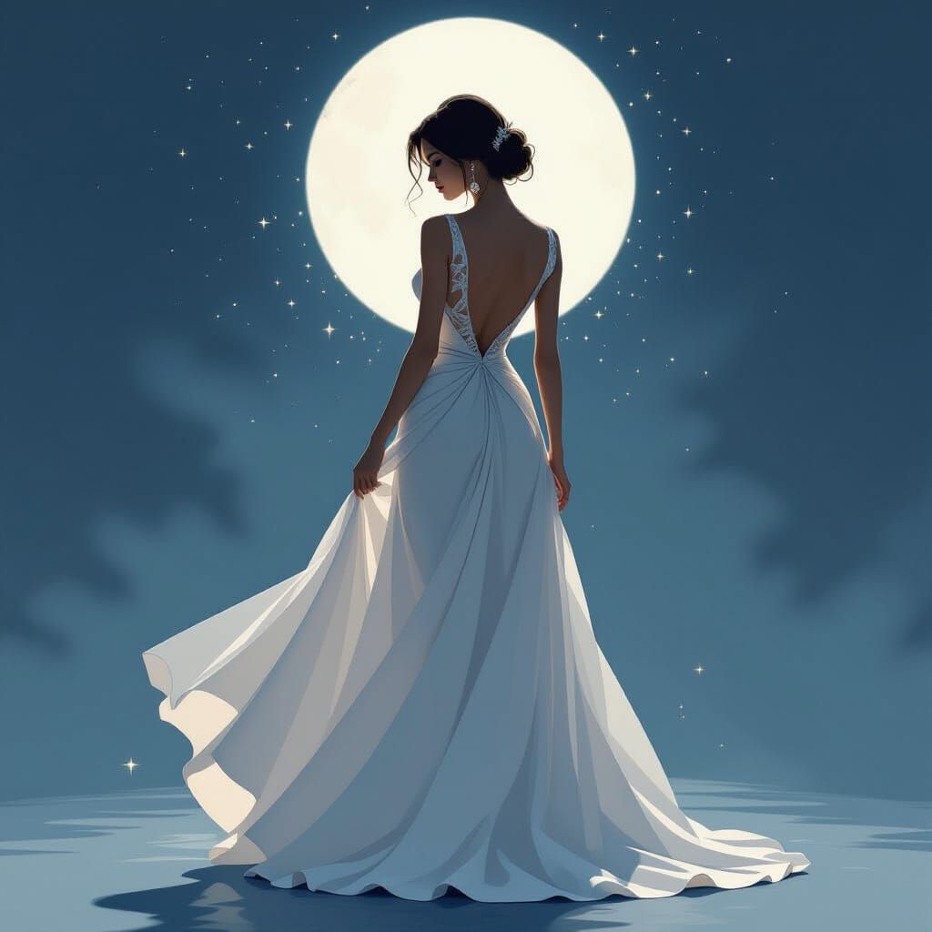 This image shows a solitary woman in an evening gown bathed in soft moonlight. Intricate shadows create a dreamy and mysterious atmosphere, rendered with delicate lines and ethereal light.