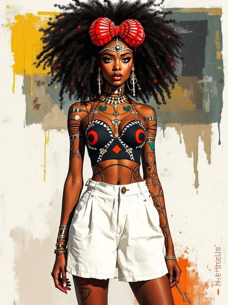 A striking picture of a figure study with bold eye contact. The subject, wearing a short white skirt, is rendered with precise geometric patterns in a surrealist style.