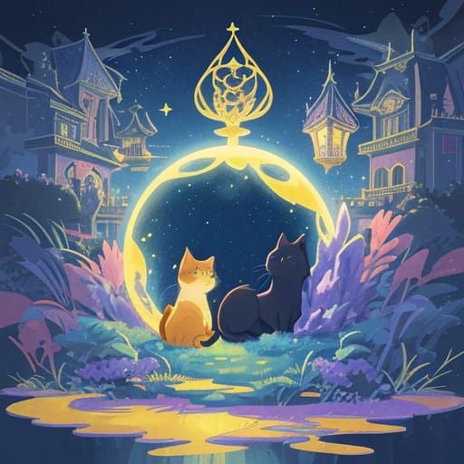 This enchanting DVD cover design transports viewers to a mystical world of cats, where fantastical landscapes and magical creatures come alive in a vibrant, dreamlike setting, reminiscent of Studio Ghibli's imaginative style.