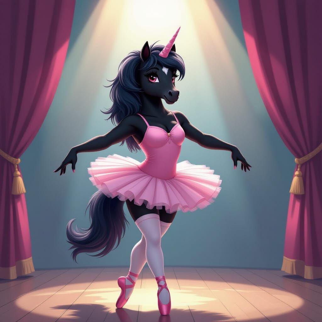 This image shows an anthropomorphic black horse in a ballet outfit on a stage. The artwork is rendered with vibrant colors and dynamic brushstrokes in a contemporary illustrative style.