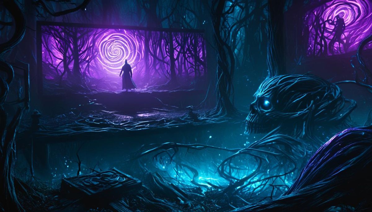 A cinematic close-up of an ominous figure in a dark, mystical forest with glowing trees. Ethereal mist swirls around the figure in this high-contrast dark fantasy concept art.