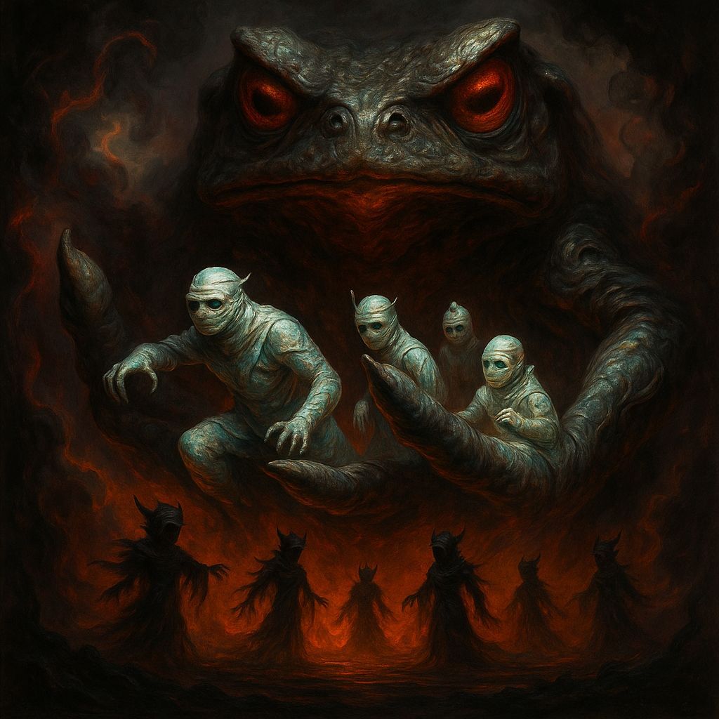 In a haunting dark fantasy landscape, a colossal, wrathful toad looms, its glowing red eyes piercing the gloom. Its shadowy hand cradles enigmatic, iridescent beingsโporcelain and wax warriors reminiscent of ancient Egyptian ninjas, their forms twisting and shifting in spectral hues. The backdrop swirls ...
