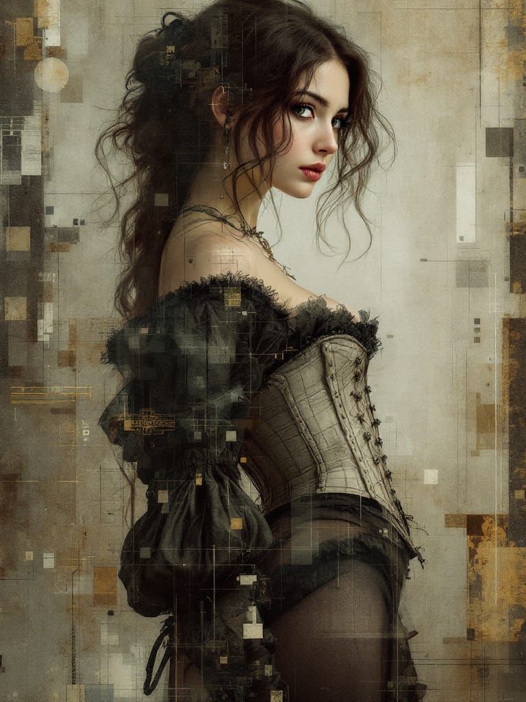 This image depicts a full-body view of a brunette pin-up woman in pantaloons and corset, presented with meticulous linework and distortion artifacts suggestive of digital corruption and technical blueprints, blending historical craftsmanship with technological interference.