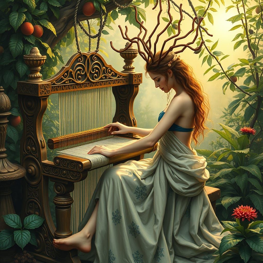 This enchanting image depicts a mythical goddess at her loom, surrounded by lush greenery and warm golden light, as she weaves a vibrant tapestry with delicate linework and soft watercolor textures, evoking the romanticism of Waterhouse and the whimsy of a fantastical world.