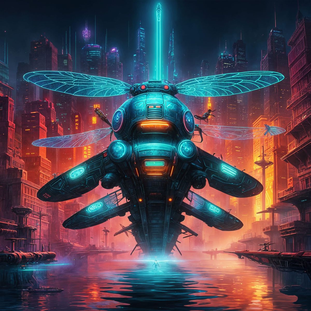 A vivid image of a dragonfly-shaped submarine with glowing neon lights hovering above water. The background features a highly detailed cyberpunk cityscape with a futuristic aesthetic.