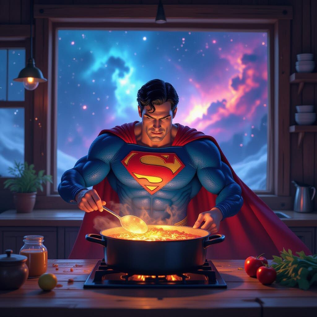 This image shows Superman cooking a vibrant, glowing stew in a rustic kitchen. A surreal cosmic view is seen through the window, with neon accents and a mystical Viking style.